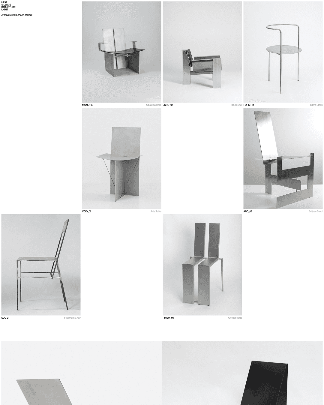 A design-led e-commerce website concept presenting furniture objects through clean grids, typographic restraint, and an editorial visual system.
